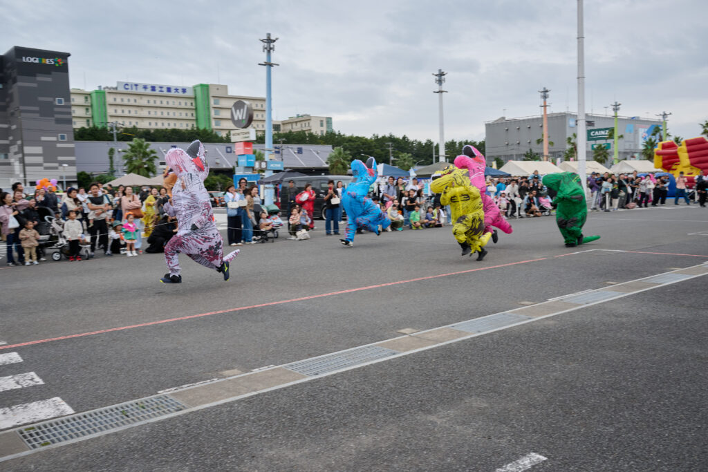 そして、特に白熱した催しの一つが「ティラノサウルスレース」 です! 雨の中、ティラノサウルスの着ぐるみを着て全力疾走するシュール…かつアツい光景に、会場からは大きな歓声が。